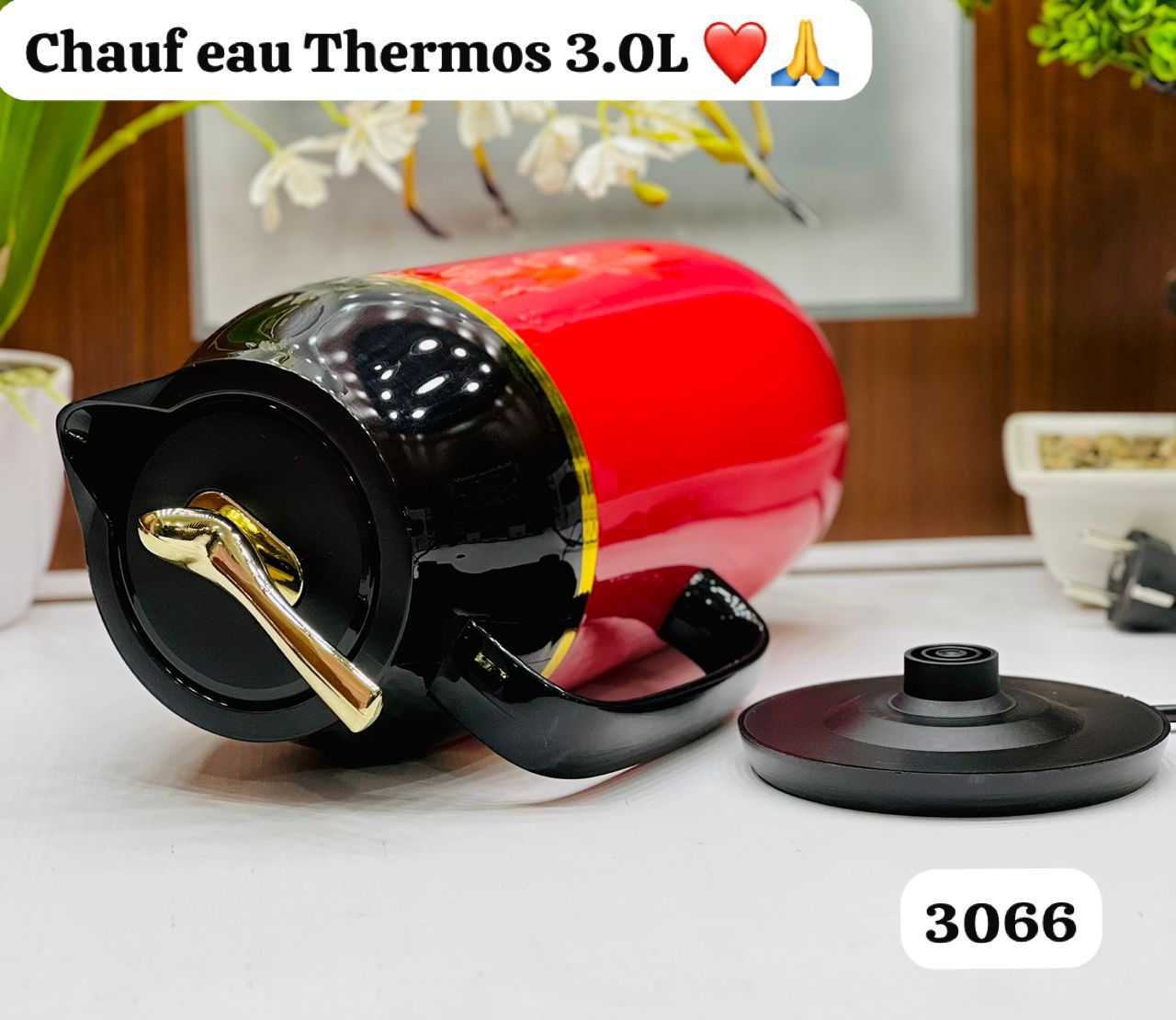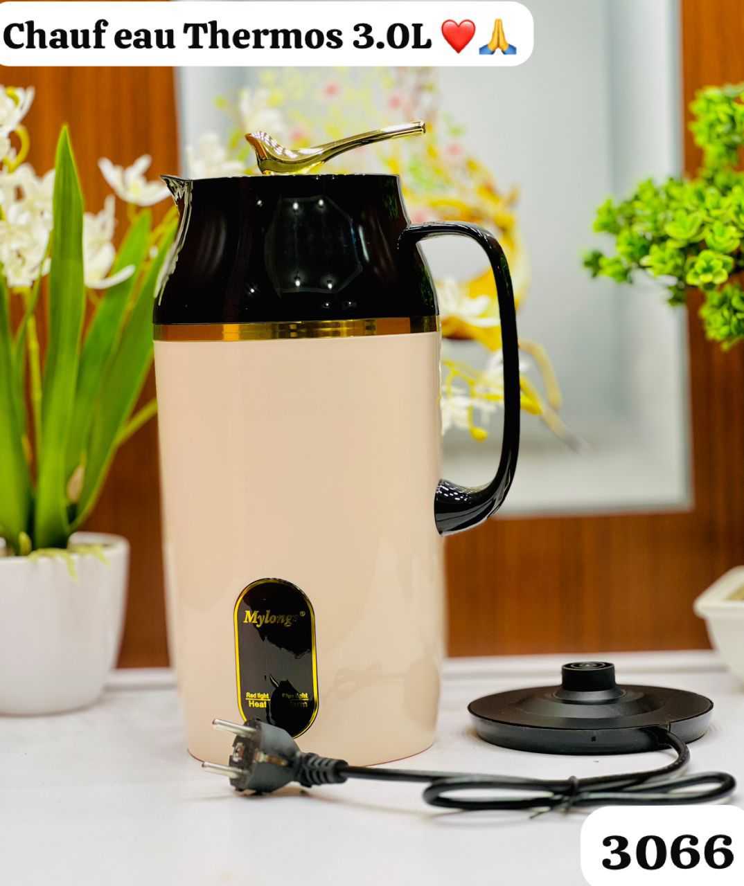 bouilloire électrique sans fil et d’un thermos 2-en-1 de la marque Mylong, modèle MY-3066. Cet appareil est conçu pour chauffer l’eau rapidement tout en la maintenant au chaud comme un thermos.